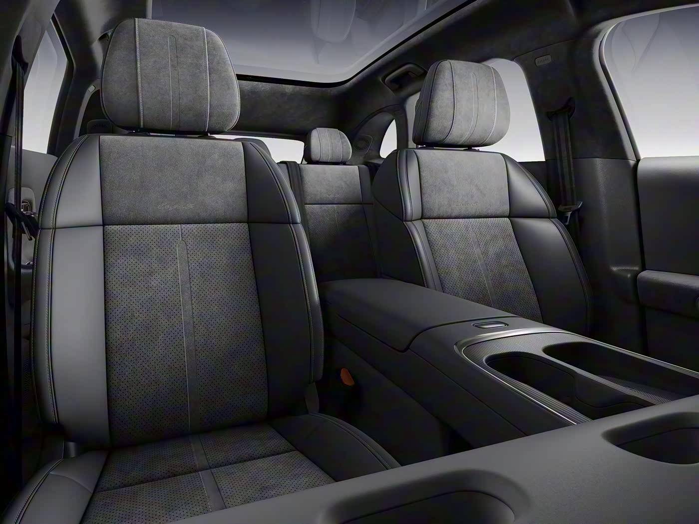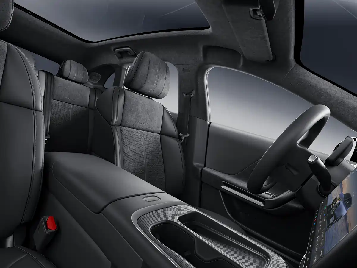 相比设计,新车最大的看点还是配色和材质,它全系采用了黑化哑光枪灰镀铬饰件,第一眼看上去就很运动,而且很高级。用料方面还有大面积的软包材质,运动和舒适都有兼顾。需要注意的是,基础款车型将提供速域紫与驰影灰两种配色,高配是竞速灰主题,而且顶棚和座椅都采用了真皮+仿麂皮超纤绒材质,并压印赛道纹理与Lafa5专属字体,运动感直接拉满。所以如果预算充足,笔者建议直接顶配。
